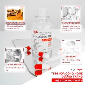 Angel’s Liquid 7Day Glutathione 700 V-Ampoule 30ml là dòng serum cao cấp đến từ Hàn Quốc, nổi bật với công dụng dưỡng trắng, làm sáng da vượt trội chỉ sau 7 ngày sử dụng. Với hàm lượng Glutathione 700mg kết hợp cùng Niacinamide, sản phẩm không chỉ giúp cải thiện sắc tố da mà còn hỗ trợ làm mờ nám, tàn nhang, và dưỡng ẩm sâu cho làn da khỏe mạnh.