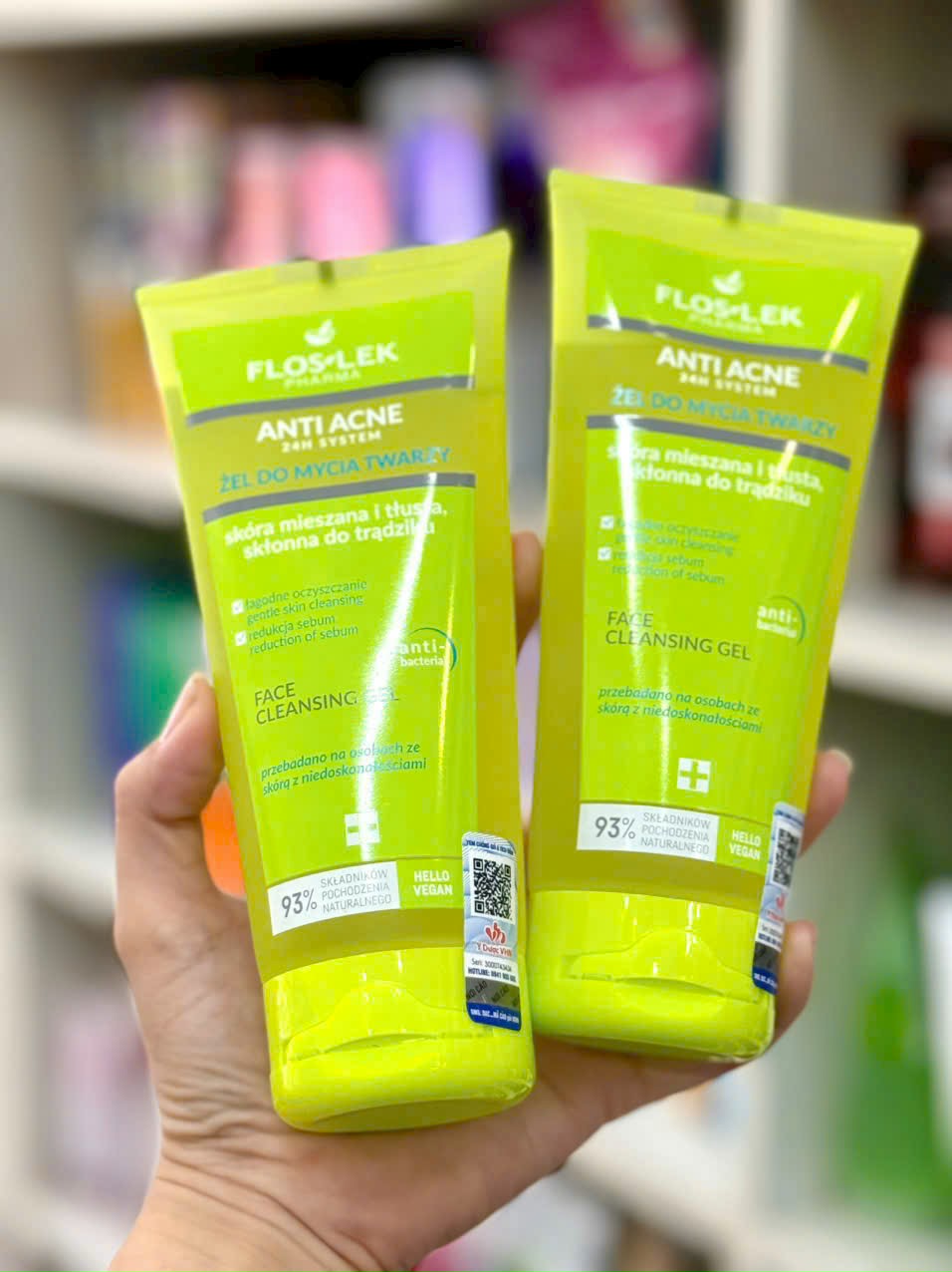 Floslek Anti Acne 24h Face Cleansing Gel 200ml là sữa rửa mặt chuyên biệt của thương hiệu dược mỹ phẩm Floslek (Ba Lan), thiết kế dành cho da dầu, da hỗn hợp dễ nổi mụn hoặc da đang có mụn. Sản phẩm hỗ trợ làm sạch sâu, kiểm soát bã nhờn, kháng khuẩn, giúp ngăn ngừa mụn và làm dịu da — rất phù hợp cho làn da cần chăm sóc dịu nhẹ nhưng hiệu quả.